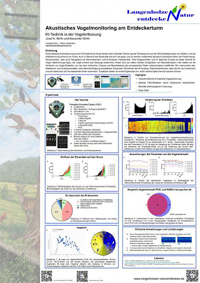 Seit Anfang April 2023 wird der Entdeckerturm zusätzlich zu den bereits seit langem installierten Kameras auch akustisch überwacht. Ein sog. Portable Universe Codec (PUC) analysiert mit Hilfe von KI stetig und völlig automatisch die Vogelstimmen rund um den Entdeckerturm. Die KI-Analyse läuft noch nicht fehlerfrei, lernt aber auch dazu. So werden sich mit menschlicher Hilfe die Analysen stetig verbessern. Jeder kann dazu beitragen und die Gesangschnipsel als "korrekt" oder "weniger korrekt" markieren. Ferner sind die Beobachtungen vom Entdeckerturm natürlich öffentlich unter: https://app.birdweather.com/stations/3632 einsehbar. Viel Spaß beim Erforschen der Vogelwelt und um den Entdeckerturm.