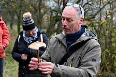 Das sind Magerrasenwiesen, Wegränder, Wälder und Totholz. Dann sollte man das Auge schärfen, um Pilze zu finden. Zu guter Letzt ging es um die Einordnung der gesichteten Pilze in verschiedene Gattungen. Ob Ständerpilze, Leistenpilze oder Schlauchpilze, um einige zu nennen. Um Pilze zuordnen zu können, sollten sie mit einem Teil Mycel herausgedreht werden. Weil auch die Form dessen wichtige Hinweise geben können. Die Fruchtkörper sollten genau inspiziert werden, aber auch die Stiele und Unterseiten der Pilzhüte, um eine Zuordnung in Lamellen- oder Röhrenpilze zu ermöglichen. Auch vorsichtige Geruchsproben dienen als Bestimmungshilfe. Die Teilnehmer zeigten sichtlich Freude und Spaß an dieser Entdeckertätigkeit und waren mit großem Interesse dabei. Es wurden Gräser zur Seite gedrängt, unter liegendem Laub gesucht und tote Äste gewendet. Über 60 verschiedene Pilze wurden gefunden und bestimmt oder klassifiziert. In Essbar, genießbar, ungenießbar oder giftig eingeordnet. Highlight der Pilzfunde waren Sommer- und Wintertrüffel, die Günther Schier´s Trüffelhund „Happy“ der Hunderasse Lagotto Romagnolo gefunden hat.