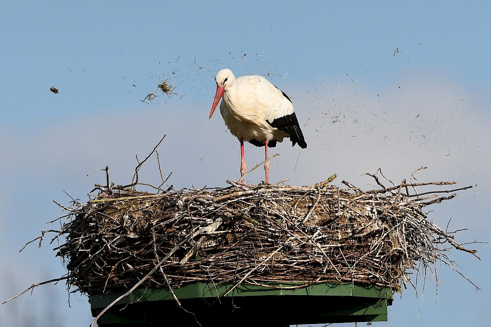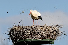 Im Februar 2014 wurde das Storchennest in der Nähe des Brüggener Kieswerks errichtet und ist seitdem regelmäßig besetzt. Störche sind nesttreu aber nicht polygam. So kommt es immer wieder zu Rangeleien, wenn ein „Stammstorch“ sein Nest gegen einen Eindringling verteidigt. Dabei kann der oder die Partnerin ein anderer als im Vorjahr sein. Ein Paar hat sich auch dieses Jahr gefunden und auch hier scheint es so als würde Nachwuchs erwartet, denn der österliche Hausputz ist voll im Gange. Das Geschehen kann vom naheliegenden Beobachtungsturm gut verfolgt werden.