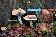 Der Herbst, der Herbst, der Herbst ist da. Er bringt uns Wind, hei hussassa! So heißt es in einem bekannten Kinderlied. Aber bei genügender Feuchtigkeit lässt er auch Pilze sprießen und erfreut damit so manches Sammlerherz. Aber wusstet Ihr, dass Pilze auch ein meteorologisches Phänomen auslösen und damit das Wetter beeinflussen können? Der sogenannte PILZWIND. Die Pilzsporen werden zum Teil durch den Wind hoch aufgetrieben und helfen bei der Wolkenbildung als Kondensationskerne und regnen somit wieder ab auf die Erde. Damit aber dieses Phänomen stattfinden kann, und die Pilzsporen nicht nur einfach zu Boden fallen, müssen die Sporen hochgetragen werden. Deshalb erzeugen die Pilze ihren eigenen AUFWIND. Die Graphik soll diesen Vorgang etwas bildlich darstellen. Neben den Sporen geben die Pilze auch Feuchtigkeit ab. Das führt dazu, dass die feuchte Luft nach unten sinkt, zur Seite driftet und damit in wärmere Luftschichten gerät. Dabei entsteht Wasserdampf der aufsteigt. Der aufsteigende Wasserdampf wiederum nimmt die Sporen mit nach oben. Allerdings können die Sporen nur bis zu einer maximalen Höhe von 10 cm getragen werden, haben aber dort die große Chance vom Herbstwind weiter getragen zu werden und damit diesen Herbst-Kreislauf aufrecht zu erhalten.